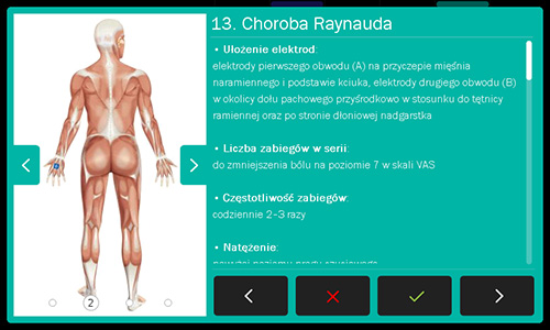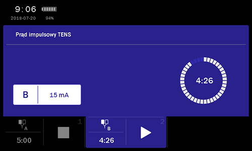 PhysioGo 100A is an electrotherapy device equipped with an encyclopedia that facilitates the performance of treatments using as many as 69 built-in treatment programs. Disease entities are sorted by field or name, it is the physiotherapist who decides on the selection method. Working with the camera thanks to the 7" color display with a touch panel is extremely simple and pleasant. Physiotherapists can set up to 50 user programs and give them their own names. In addition, the device has an intermittent mode for unidirectional (unipolar) currents and full galvanic isolation between channels in each mode. It works in CC (current stabilization) or CV (voltage stabilization) modes. The safety of treatments is influenced by the electrode test, an option that allows you to assess their wear and tear.